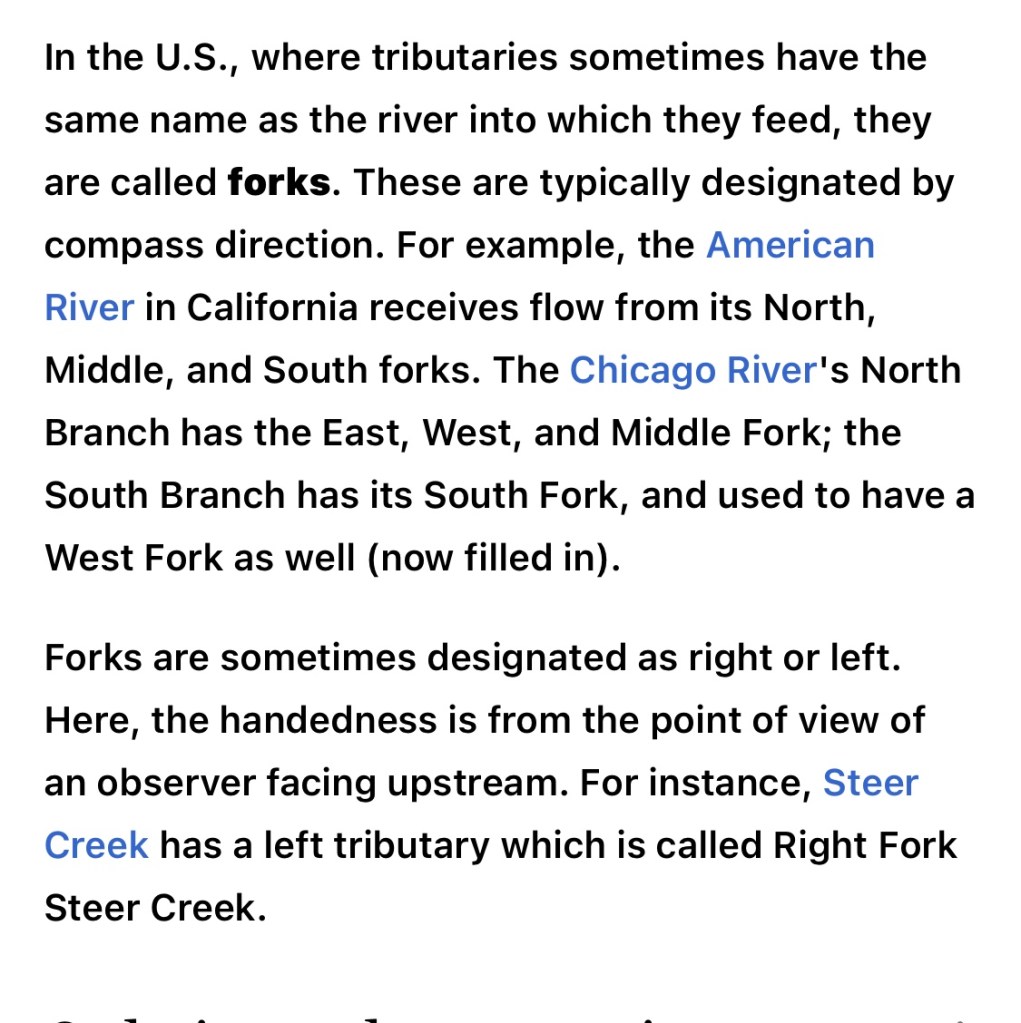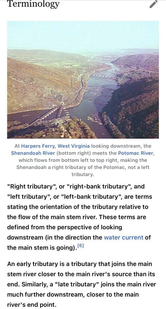 A confluence, where two or more bodies of water meet, usually refers to the joining of tributaries.